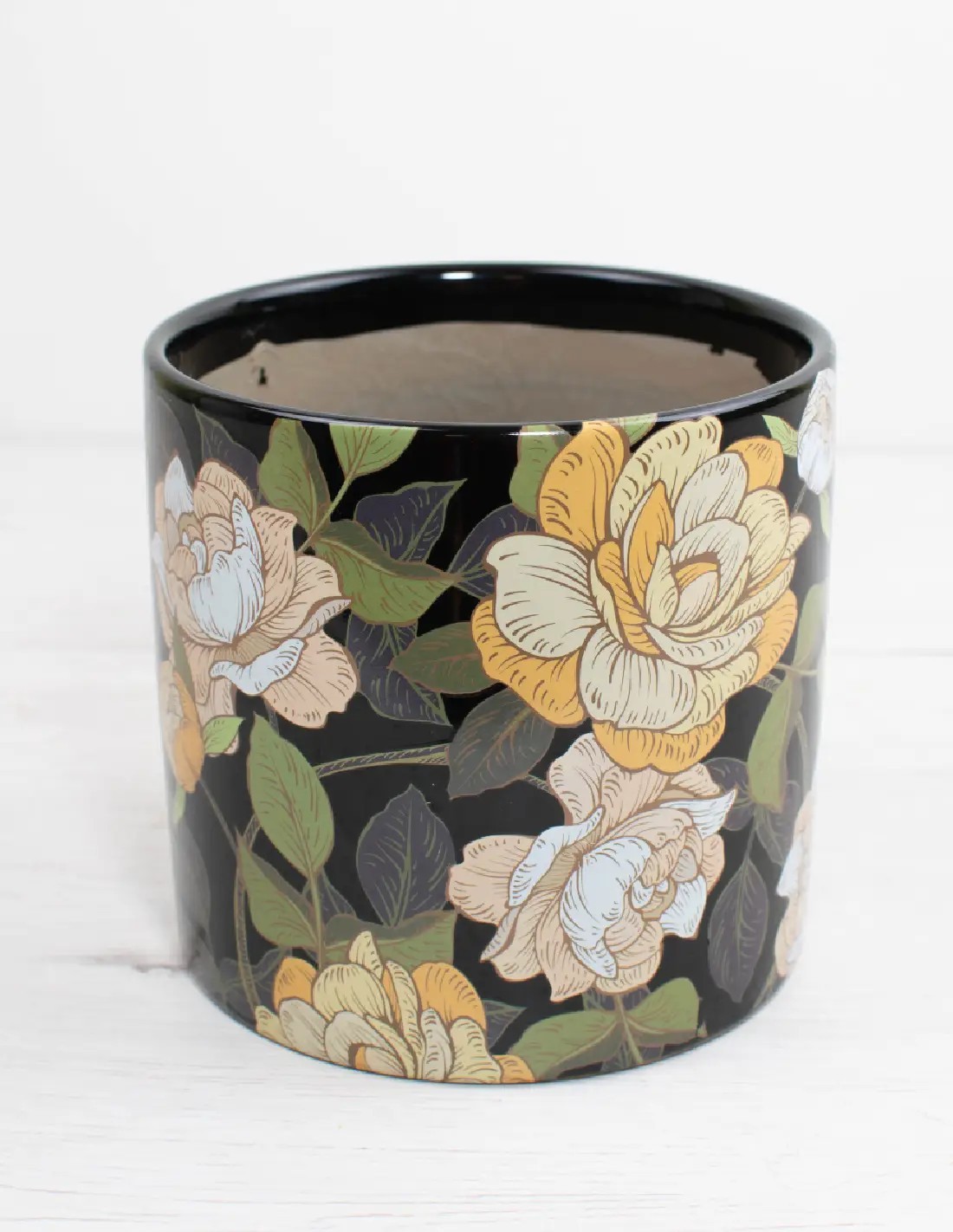 Su diseño en color negro con estampado floral aporta un aire contemporáneo y sobrio, ideal para realzar desde suculentas diminutas hasta plantas de mayor porte. Además, es fácil de limpiar y resistente, ayudando a mantener el suelo limpio y a destacar los colores y texturas de tus plantas favoritas.