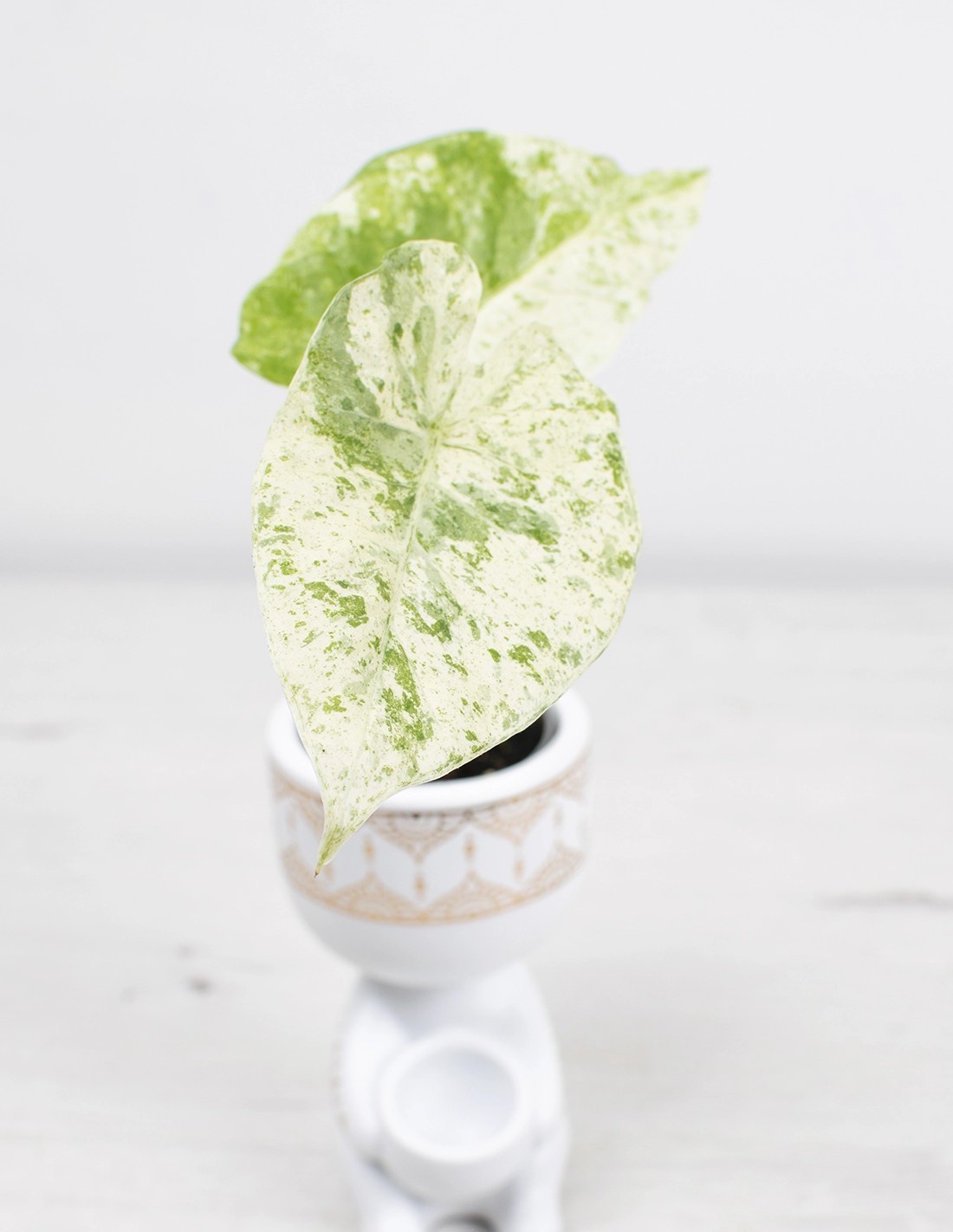 La Alocasia macrorrhizos 'Camouflage' es una planta de interior extremadamente buscada por coleccionistas y amantes de las plantas exóticas debido a su peculiar y llamativo follaje. Esta variedad se distingue por sus grandes hojas con un patrón que imita el camuflaje, combinando tonos de verde, amarillo y crema, lo que le otorga una apariencia salvaje y única.